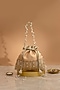 Featuring a peach handcrafted potli in poly silk brocade base with cutdana lace embellishment, pearl tassels and drawstring detailing. It has a poly satin lining and a metal embellished sling handle. A perfect companion for festive occasions and evening soirees, this piece exudes sophistication and complements every ensemble effortlessly.