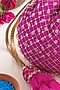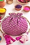 Featuring a pink potli in banarasi silk base with golden thread embroidery, golden scalloped lace, and layered thread tassels.