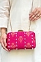 Featuring a pink clutch in pure silk base with pearl and floral zari motifs hand embellishments. It has a suede lining, golden metal clutch frame and a sling. Designed for both style and comfort, this bag add a touch of elegance to any outfit, perfect for weddings, festive occasions, and ethnic or fusion outfits.