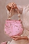 Featuring a pink purse in velvet base with a scalloped border, tassel detailing, pearls and bead embellishments. It has a suede lining and a handcrafted handle. Perfect companion for weddings, festive celebrations, and special occasions, adding a touch of understated glamour to your look.