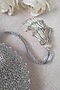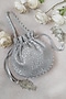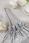 Featuring a silver potli in net base with pearl tassels, pearl rose gold thread drawstrings and a handle, including sequins embroidery. It has a poly satin lining.