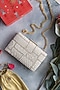 Featuring a white clutch in georgette and metal base with patchwork embroidery. It has a poly satin lining and a golden metal sling.