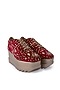 Featuring a pair of crimson red wedge sneakers in velvet base with gold dabka pitta, sequins, and aztec motif embellishments. It has a genuine leather underlining and 3.25-inch heels.