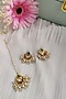Featuring a 22Kt micro gold plated choker necklace studded with pachi kundan, cluster pearls and ruby, set in copper. It is paired with a matching pair of earrings and a maangtikka. The necklace set is ideal for festive or wedding occasions.