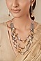 Featuring a two-tone finish long temple necklace studded with pearls and peach stones, set in brass. It is paired with a matching pair of earrings. Perfect wear for festive occasions or wedding ceremonies.