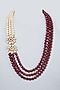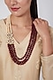 Featuring a gold finish multi strand necklace studded with red agate beads, cream pearls, and a kundan polki pendant, set in mixed metal.