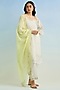 Featuring an ivory high-low kurta in mul chanderi base with golden stripe patch and floral embroidery. It is paired with embroidered pants, a cotton spaghetti slip and a yellow scalloped dupatta. Accentuate it with statement earrings and heels for weddings or sangeet ceremonies.