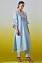 Featuring a light blue kaftan style kurta in silk chanderi base with embroidery. It is paired with embroidered palazzo pants. Accentuate it with statement earrings and heels for festive occasions.