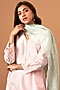 Featuring a pink kurta in silk chanderi base with cutdana, pearls, beads, resham and sequins embroidery, including scalloped sleeves and v-neckline. It is paired with matching embroidered palazzo pants and a contrasting mint chanderi tissue dupatta.