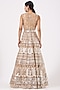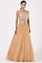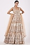Featuring a beige anarkali jacket in net base with embroidery. It is paired with a matching bustier and a net dupatta.