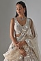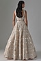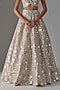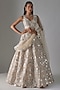Featuring a beige and cream lehenga in organza base. It is paired with a blouse and a net dupatta. Accentuate it with statement jewellery and heels for a bridal look or weddings.