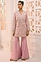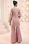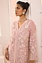 Featuring a blush pink jacket style kurta in organza base with a V-neckline, thread, pearl, sequins and beads hand embroidery. It is paired with a silk tube top and flared sharara pants having scalloped border. Accentuate it with statement crystal or polki earrings, a sleek clutch, and embellished heels for a stylish ensemble, ideal for festive occasions or pre-wedding functions.