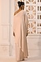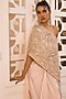 Featuring a dull ivory one-shoulder overlay in organza base with abstract floral beads and cutwork embroidery. It is paired with a satin draped Dhoti-Style skirt. Accentuate it with statement crystal earrings, a sleek clutch and strappy heels for a stylish ensemble, ideal for cocktail parties, sangeet nights or glamorous evening events.