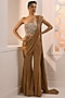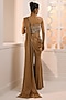 Featuring a gold draped pant saree in crinkle satin chiffon base. It is paired with an organza one-shoulder corset having hand embroidery. Accentuate it with statement crystal or polki earrings, a sleek clutch, and embellished heels for a stylish ensemble, ideal for sangeet celebrations or reception festivities.