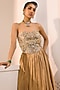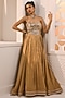 Featuring a gold lehenga in tissue silk base with embroidery. It is paired with an organza corset having sequins and kundan stone work. Accentuate it with statement drop earrings, a delicate ring stack, and embellished heels for a stylish ensemble, ideal for cocktail parties, reception celebrations or sangeet nights.