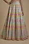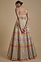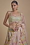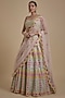 Featuring an ivory lehenga in organza base with multi-colored applique, thread, and mirror embroidery. It is paired with a blouse and a blush pink net dupatta. Accentuate with statement jewellery and heels for a wedding or engagemnet ceremony.