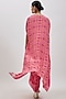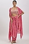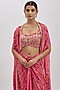 Featuring a pink cape in crepe base. It is paired with a skirt having centre knot detail and a blouse. Accentuate it with statement jewellery and heels for weddings or sangeet ceremonies.