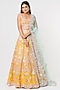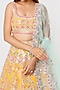 Featuring a yellow lehenga in georgette base with foil, gota, and mirror embroidery. It is paired with a matching blouse and a contrasting blue net dupatta.