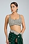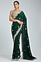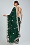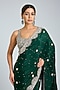 Featuring a bottle green saree in crepe base with embroidery. It is paired with an embroidered blouse and an underskirt. Accentuate it with soft curls, swarovski jewellery, embellished heels and a potli bag for a wedding or mehendi ceremony.