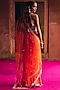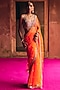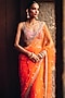 Featuring a bright orange saree in net base with mirror border detail. It is paired with a red blouse and an underskirt. Style this designer set with wedges, gold jhumkas and a sleek bun for a traditional look. Ideal for weddings or sangeet ceremonies.