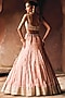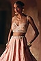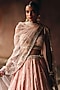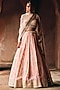 Featuring a dusty peach lehenga in banarasi tissue base with mirror motifs, zari and gota embroidery. It is paired with a blouse and a dupatta. Style this designer set with wedges, gold jhumkas and a sleek bun for a traditional look. Ideal for weddings or sangeet ceremonies.
