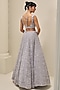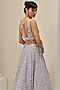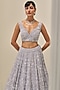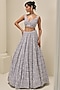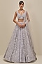 Featuring an ice grey lehenga in satin organza base with sequins, cutdana and crystal embroidery in geometric pattern. It is paired with a structured blouse and a scalloped dupatta. Accentuate it with dangler earrings and embellished heels for a sangeet, cocktail or wedding ceremony.