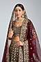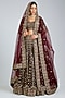 Featuring a maroon lehenga in velvet base with embroidery. It is paired with an embroidered blouse and a pair of embroidered dupattas. Accentuate the designer lehenga with a sleek bun, kundan polki or gold jewellery, embellished heels and a potli bag for a bridal look. Perfect wear for your wedding or engagement ceremony.