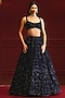 Featuring a midnight blue lehenga in net base with tonal embroidery. It is paired with a blouse and an embroidered dupatta having tassels detailing. Accentuate it with statement jewellery, a coordinated clutch and classic embellished heels for a stylish ensemble, ideal for weddings, sangeet nights or engagement ceremonies.