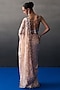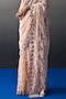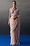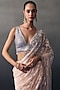 Featuring a peach saree in chantilly base with leather applique and mirror work. It is paired with a blouse and a petticoat. Accentuate the designer saree with jewellery, embellished heels and a potli bag for a wedding, sangeet or engagement ceremony.