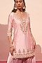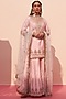 Featuring a pink kurta in raw silk base with zardosi, cutdana, resham, sequins, and dabka embroidery. It is paired with matching embroidered sharara pants and an ice-blue dupatta.