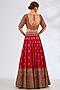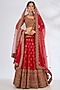 Featuring a red lehenga in raw silk base. It is paired with a blouse and two dupattas. Accentuate it with statement jewellery and heels for a wedding or engagement ceremony.