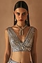 Featuring a steel grey lehenga in satin organza base with cutdana, sequins and crystal embroidery. It is paired with a blouse having a plunging neckline and a sheer dupatta. Accentuate it with dangler earrings and embellished heels for a sangeet, cocktail or wedding ceremony.