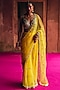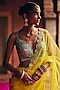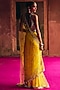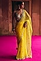 Featuring a yellow saree in net base with mirror scallop border detail. It is paired with a teal mirror work blouse and an underskirt. Style this designer set with wedges, gold jhumkas and a sleek bun for a traditional look. Ideal for weddings or haldi ceremonies.