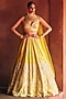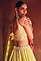 Featuring a yellow lehenga in raw silk base with thread and mirror embroidery. It is paired with a blouse and a dupatta. Style this designer set with wedges, gold jhumkas and a sleek bun for a traditional look. Ideal for weddings or haldi ceremonies.
