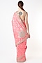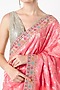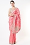 Featuring a coral pink saree in handloom woven silk base with zardosi embroidery. It is paired with a matching unstitched blouse.