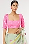 Featuring an aqua green and blush pink saree in kota doria base with hand block printed polka flowers and tassles on pallu. It is paired with a contrasting french crepe unstitched blouse having foil print. Accentuate with statement jewellery and heels for a festive occasion.