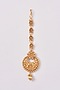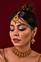 Featuring a 22kt gold plated necklace with carvings, set in mixed metal. It is paired with a matching pair of jhumka earrings and a maangtikka. Perfect wear for festive occasions or wedding ceremonies.