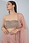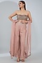 Featuring champagne palazzo pants in silk organza base with bead embroidery. It is paired with an embroidered strapless tube and a dupatta. Accentuate with statement earrings and heels for a festive look.