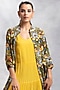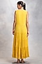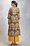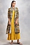 Featuring a mustard tiered dress in thin cotton base. It is paired with a contrasting multi-colored cotton front-open jacket having bird jaal print.