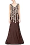 Featuring a flared marsala gown in silk base appliqued with sequin, cutdana and thread embroidered flowers all over top front and back. It has a deep V back with zipper closure.