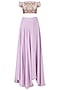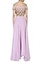 Featuring a lavender off shoulder blouse in geo base with zardozi hand embroidery on front. It is paired with asymmetrical flared lehenga skirt along with matching dupatta with embroidered edges.