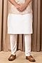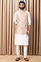 Featuring a beige nehru jacket in cotton and silk base with machine embroidery. It is paired with a contrasting ivory white kurta and churidar pants.