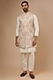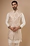 Featuring a beige indowestern in silk base with embroidery. It is paired with a kurta and pants. Perfect attire for festive occasions, exuding traditional charm and elegance.