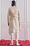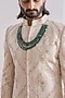 Featuring a champagne beige sherwani in jacquard and imported crepe base with hand embroidery. It is paired with a matching kurta and churidar pants.