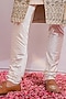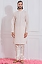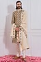 Featuring a gold sherwani in cotton silk base with hand embroidery. It is paired with matching churidar pants, a kurta, a stole, and a safa.
