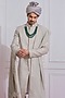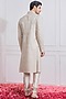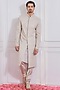 Featuring a porcelain grey sherwani in pure georgette and cotton silk base with machine embroidery. It is paired with a matching kurta and churidar pants.