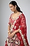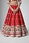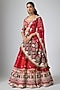 Featuring a red lehenga in raw silk base with tikki, moti, cutdana, mirror, thread work and zardosi embroidery. It is paired with a blouse and an organza dupatta. Accentuate it with statement jewellery, low bun, heels and a potli for a wedding, sangeet or engagement ceremony.