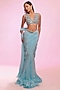 Featuring an aqua blue draped saree in crepe base. It is paired with a net sleeveless blouse having mirror, bead and sequins embroidery, including plunging V-neckline. Accentuate it with statement jewellery and heels for cocktail events, wedding ceremony or festive occasions.