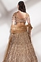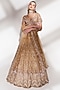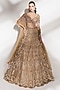 Featuring a gold lehenga in net base with sequins and beads embroidery. It is paired with a blouse having embellishment and pearl drop sleeves and a dupatta. Accentuate it with statement jewellery and elegant heels for a stylish ensemble, perfect for cocktail receptions or modern wedding festivities.