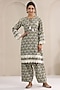 Featuring a green straight kurta in cotton base with print and lace detailing. It is paired with balloon-shaped pants and a dupatta. Accentuate it with statement jewellery and heels for a festive occasion, pooja ceremony or family gathering.